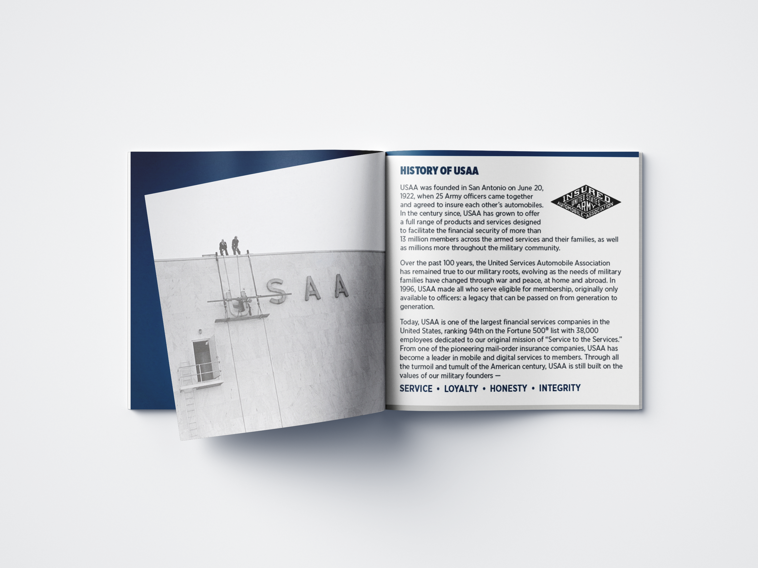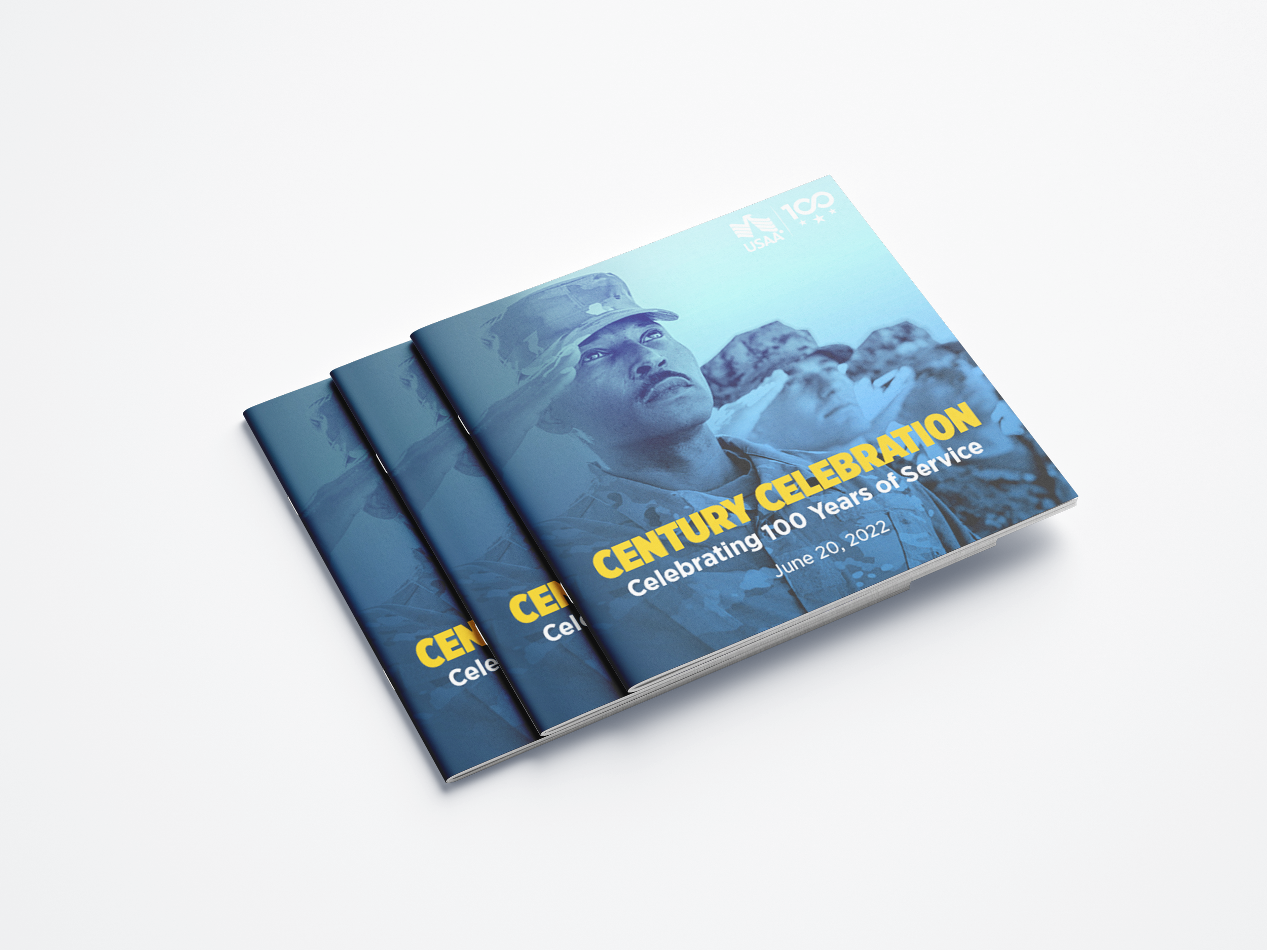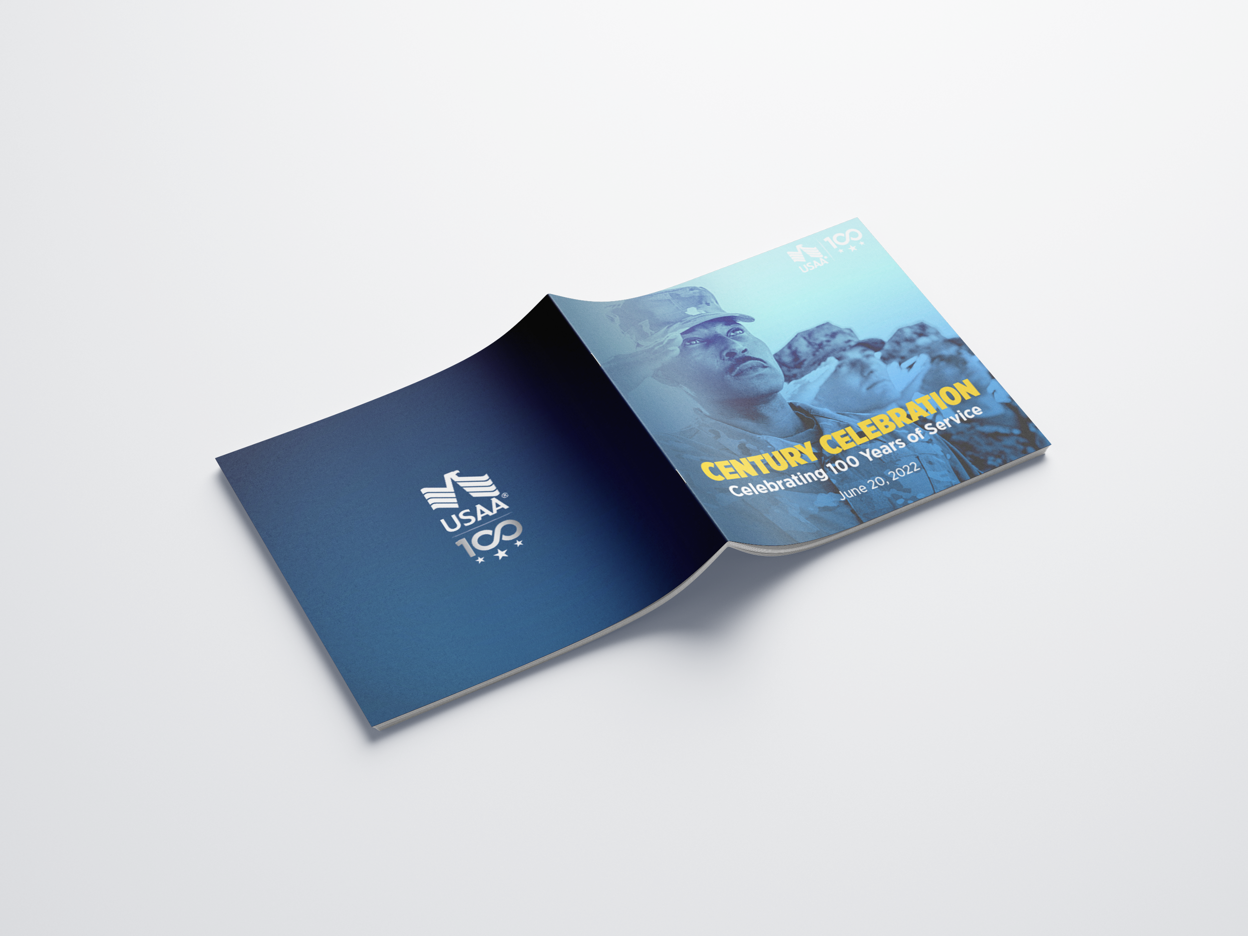 A compact 5" × 5" printed booklet designed as a commemorative keepsake for USAA's centennial celebration. The piece guides readers through the company's 100-year history, core mission, and vision for the future, balancing archival photography with clean editorial layouts. Produced for mass distribution as a tangible memento of the milestone event.