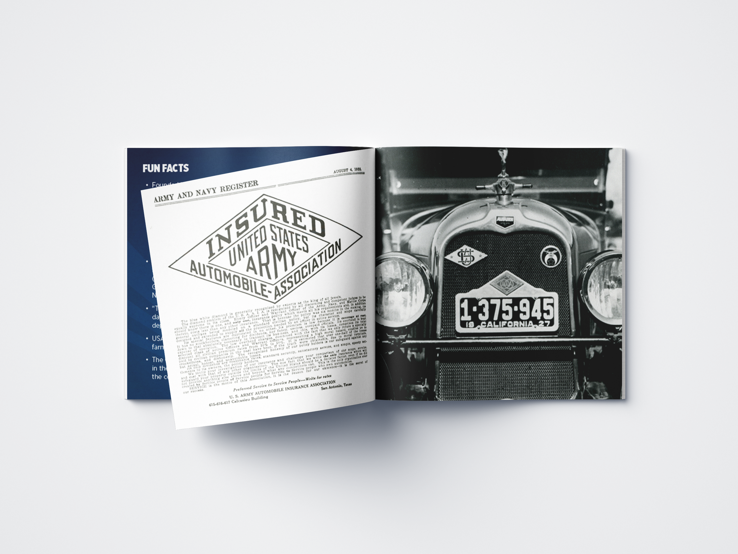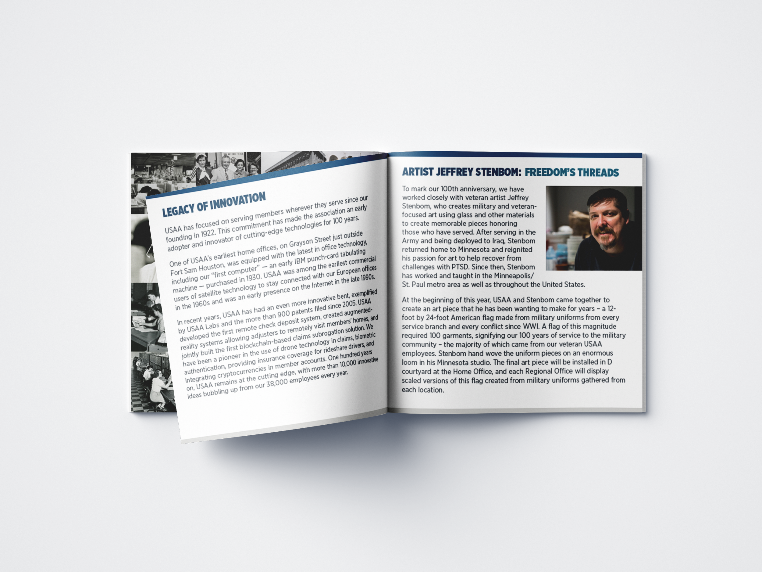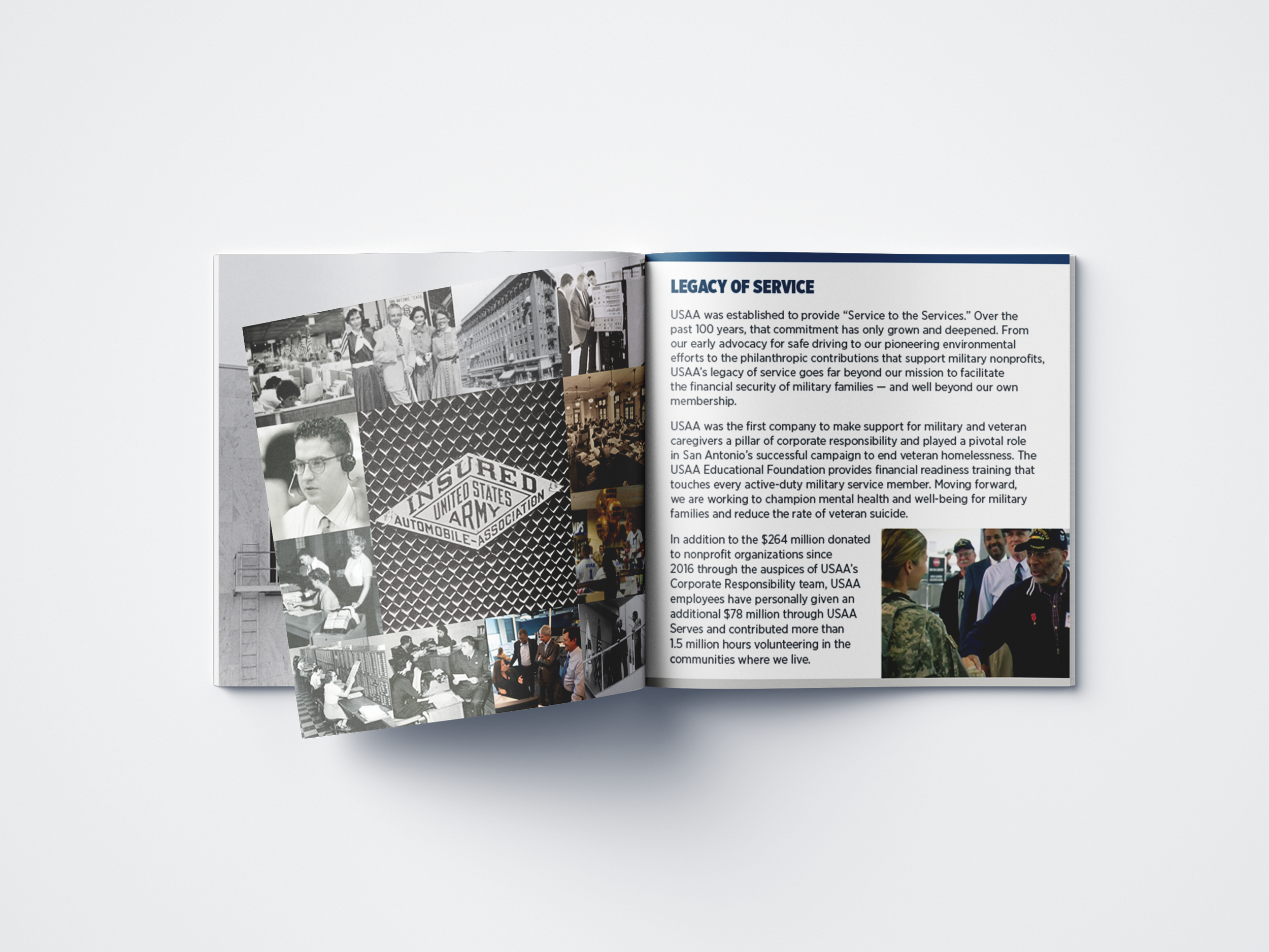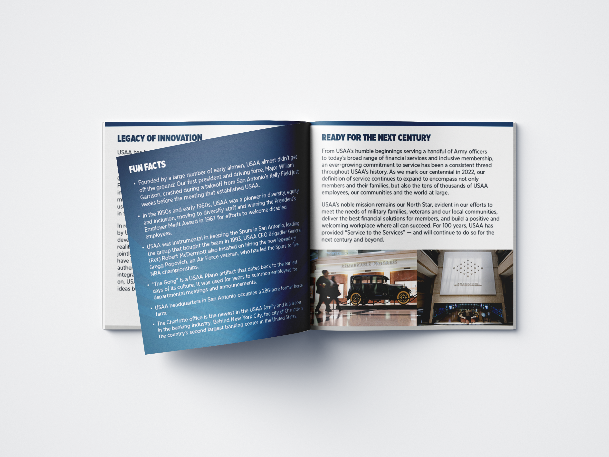 A compact 5" × 5" printed booklet designed as a commemorative keepsake for USAA's centennial celebration. The piece guides readers through the company's 100-year history, core mission, and vision for the future, balancing archival photography with clean editorial layouts. Produced for mass distribution as a tangible memento of the milestone event.