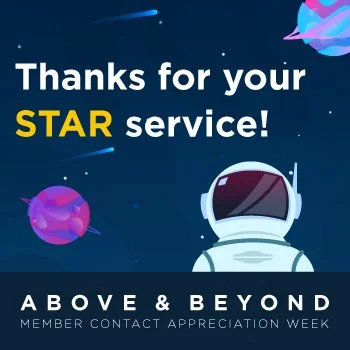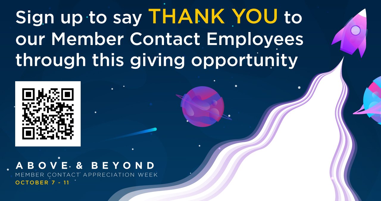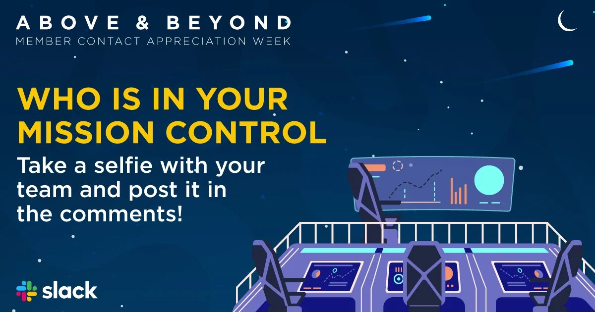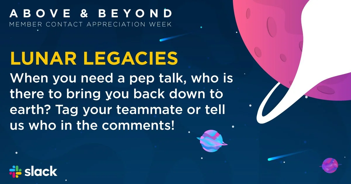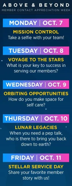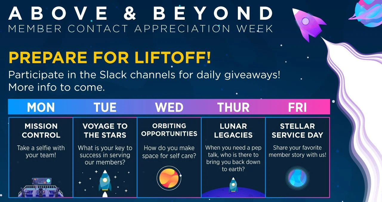 A fully self-contained internal campaign celebrating the company's front-line member contact employees during a dedicated week of appreciation. Three theme concepts were pitched — Olympic, Rock Star, and Space — with the space theme selected for its versatility and natural alignment with the "above and beyond" messaging. Because this was completely internal, there was significant creative liberty to stretch beyond standard brand guidelines and fully commit to the concept while still incorporating key brand elements such as the colors and typography.