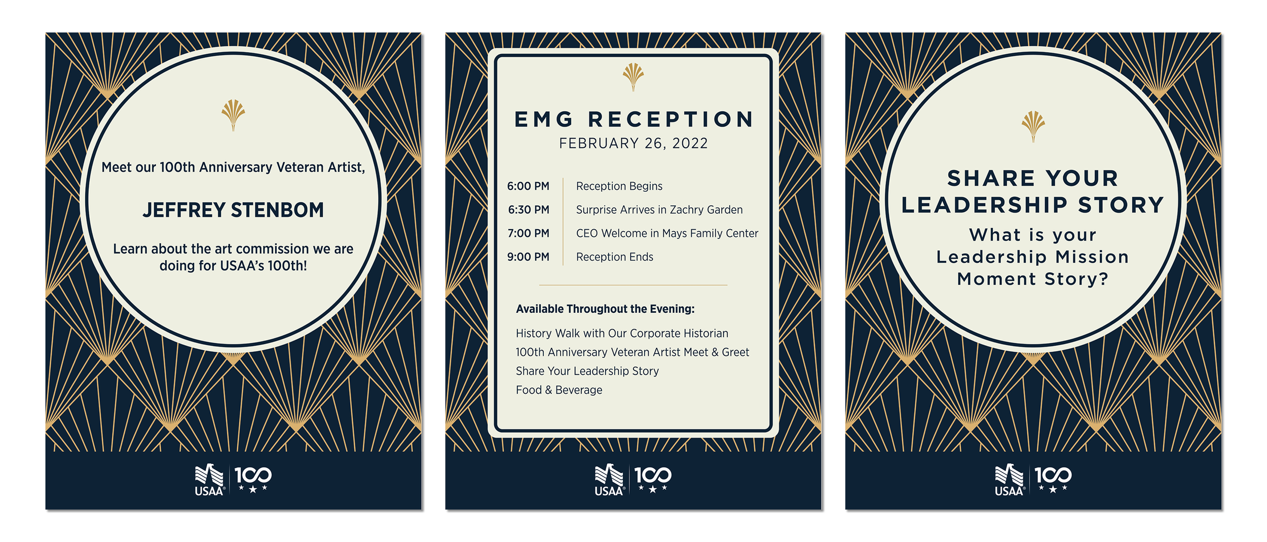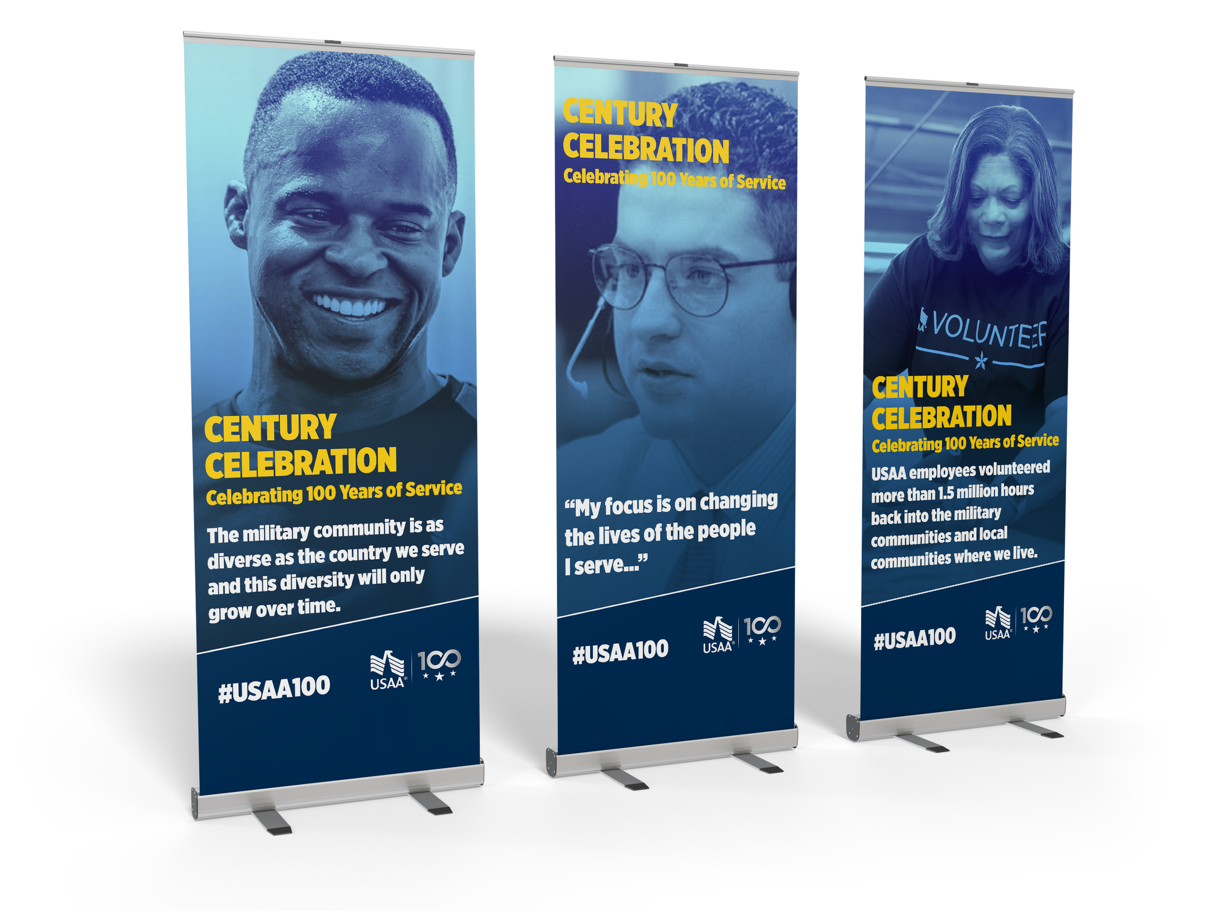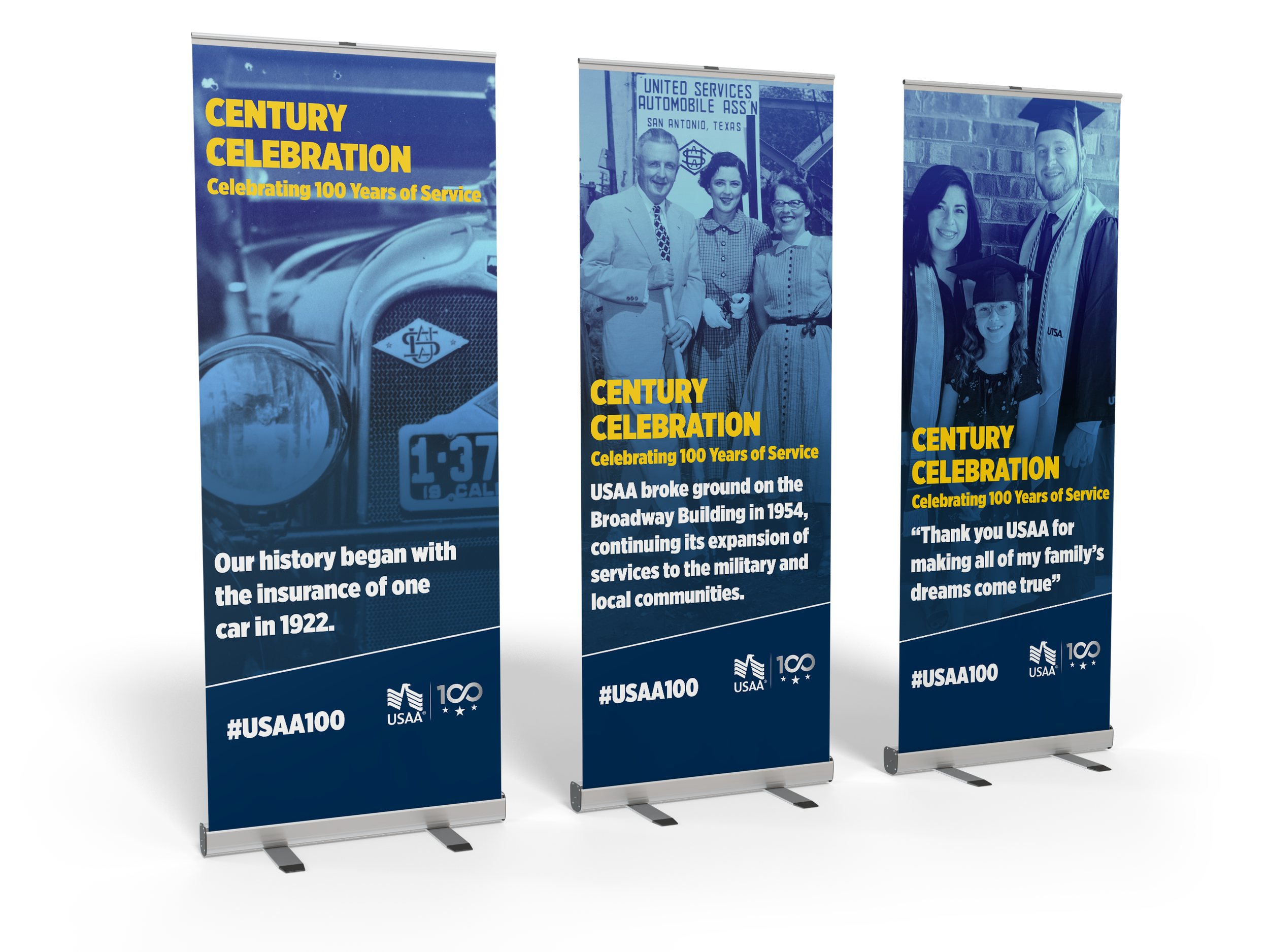 A series of six retractable banners designed to mark USAA's 100th anniversary and displayed throughout the company's corporate home office. Each panel draws from a distinct chapter of the organization's century-long story — from its founding in 1922 to its present-day commitment to military families and community service.