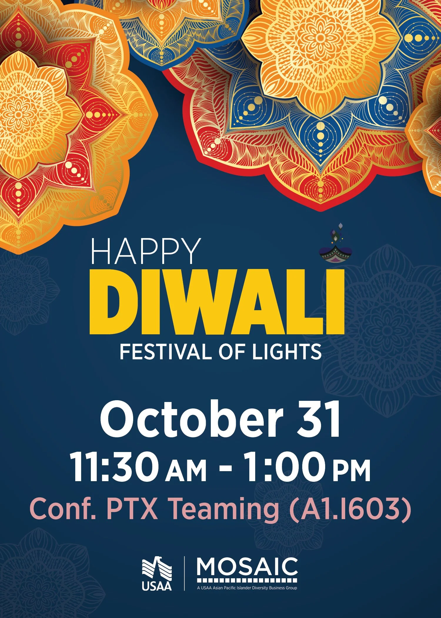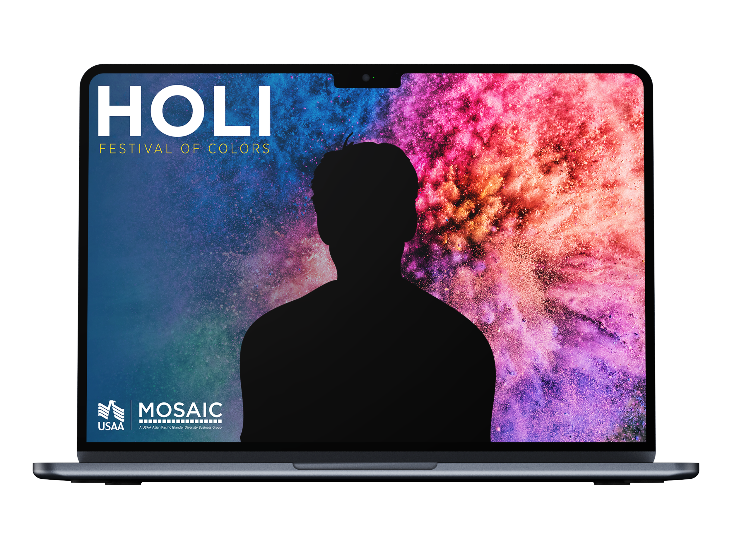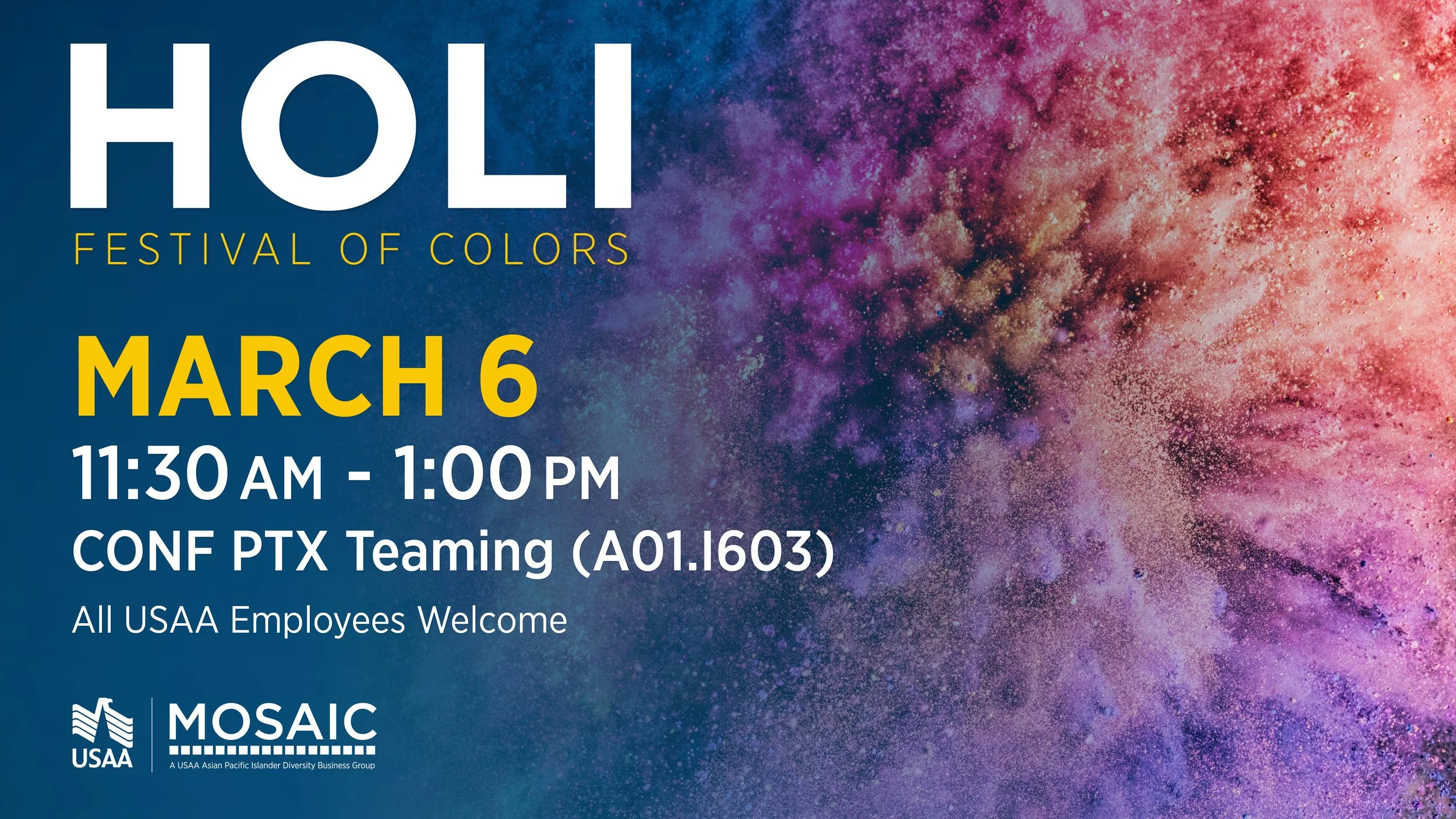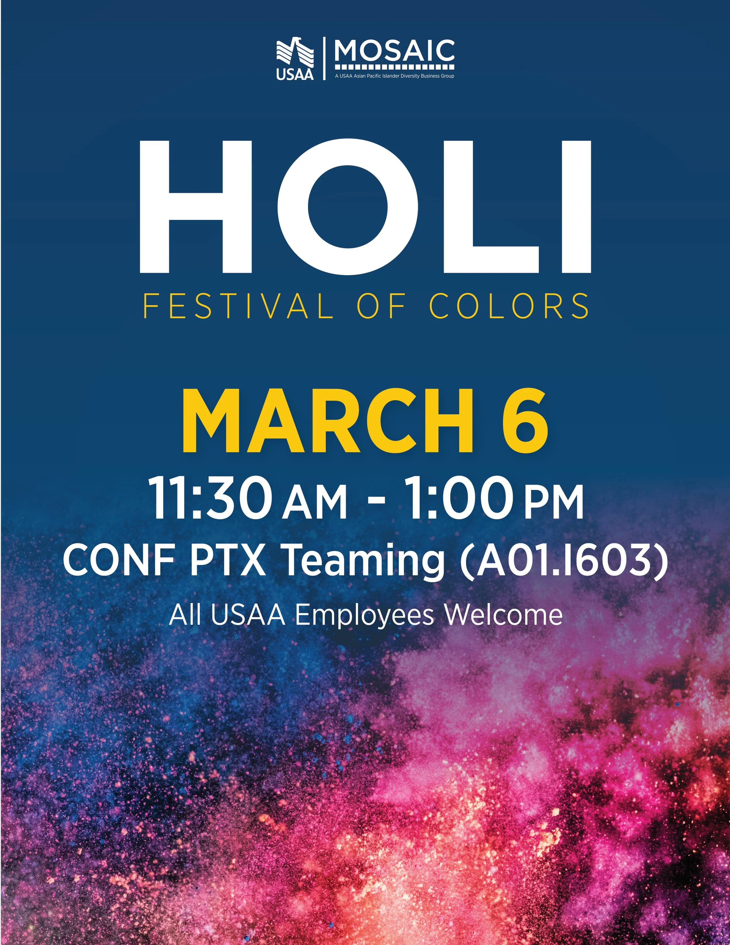 Cultural Celebrations Campaign How do you create an atmosphere that will allow thousands of employees feel seen and celebrated? For USAA's MOSAIC Employee Impact Group, the answer started with design. I created a full suite of themed internal communications — digital billboards, printed posters, flyers, Slack graphics, and Zoom backgrounds — to promote cultural celebration events held on campuses nationwide. Each campaign was built around the event's cultural identity, from AANHPI Heritage Month to Diwali's Festival of Lights to Holi's Festival of Colors, creating a distinct visual language for each while maintaining adherence to USAA's brand.