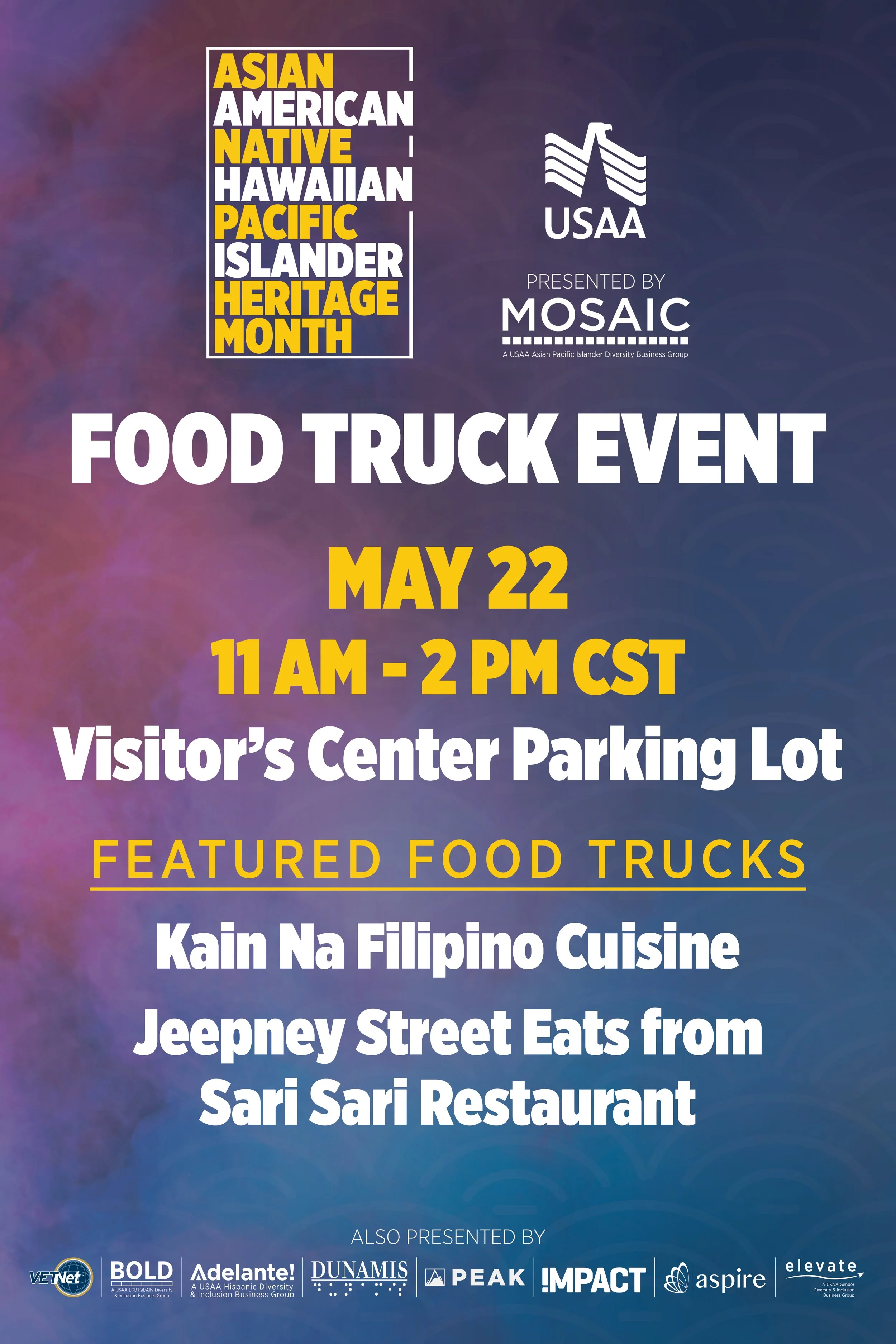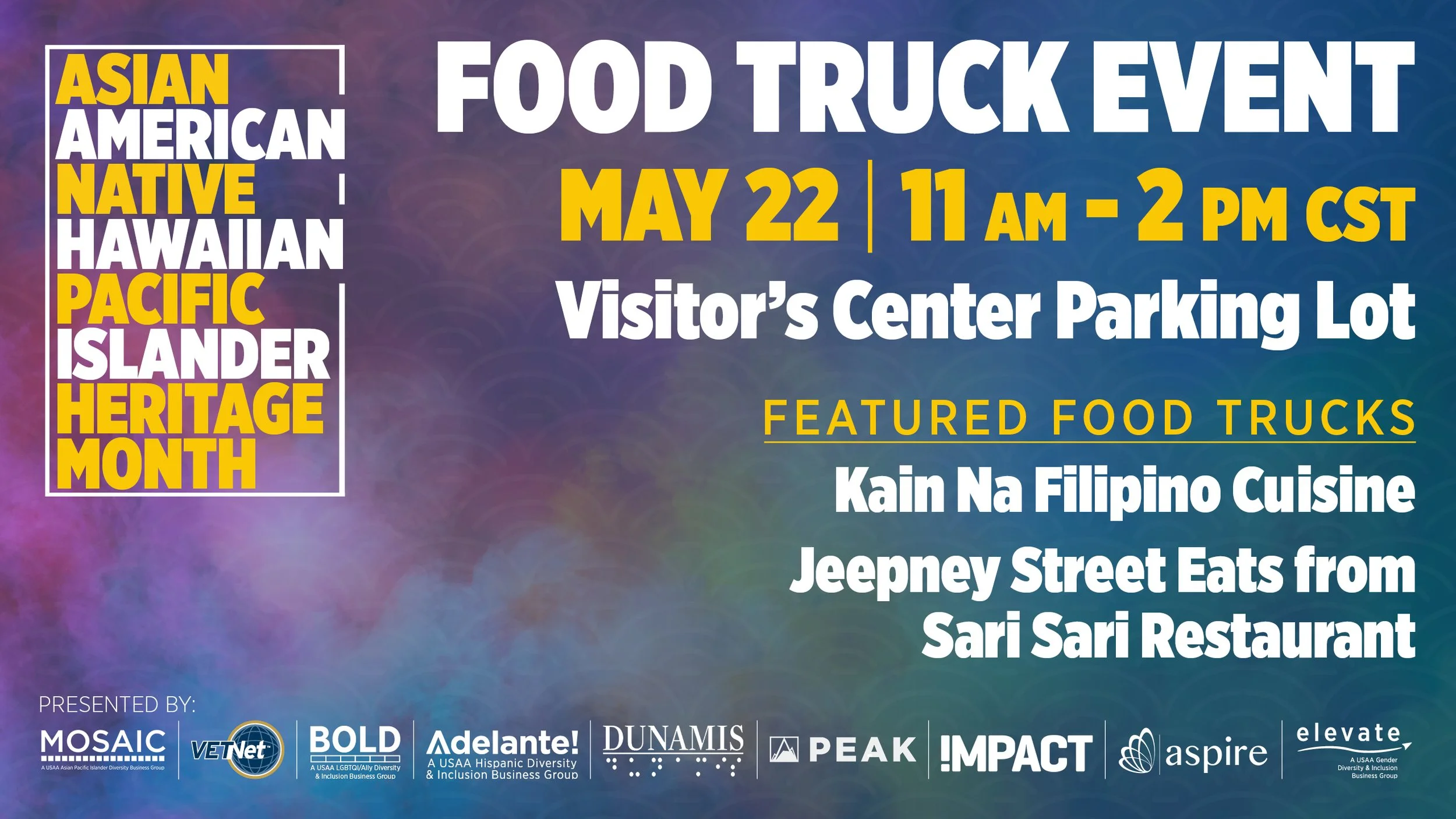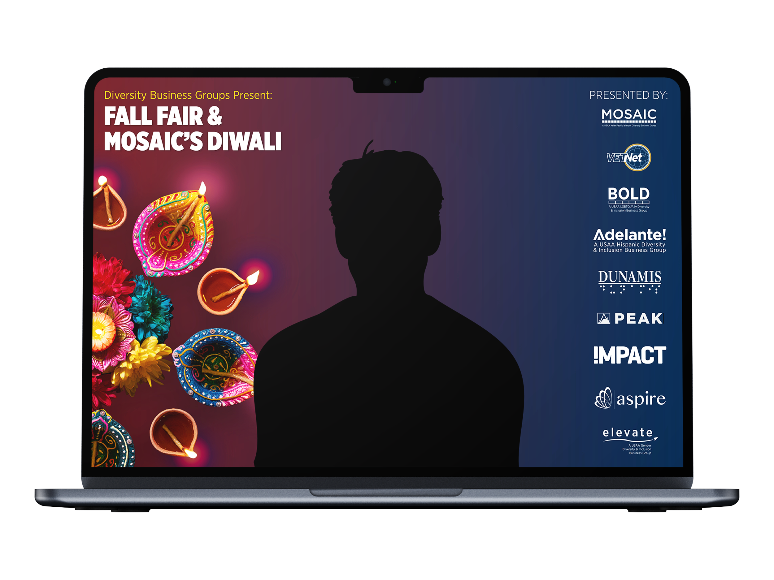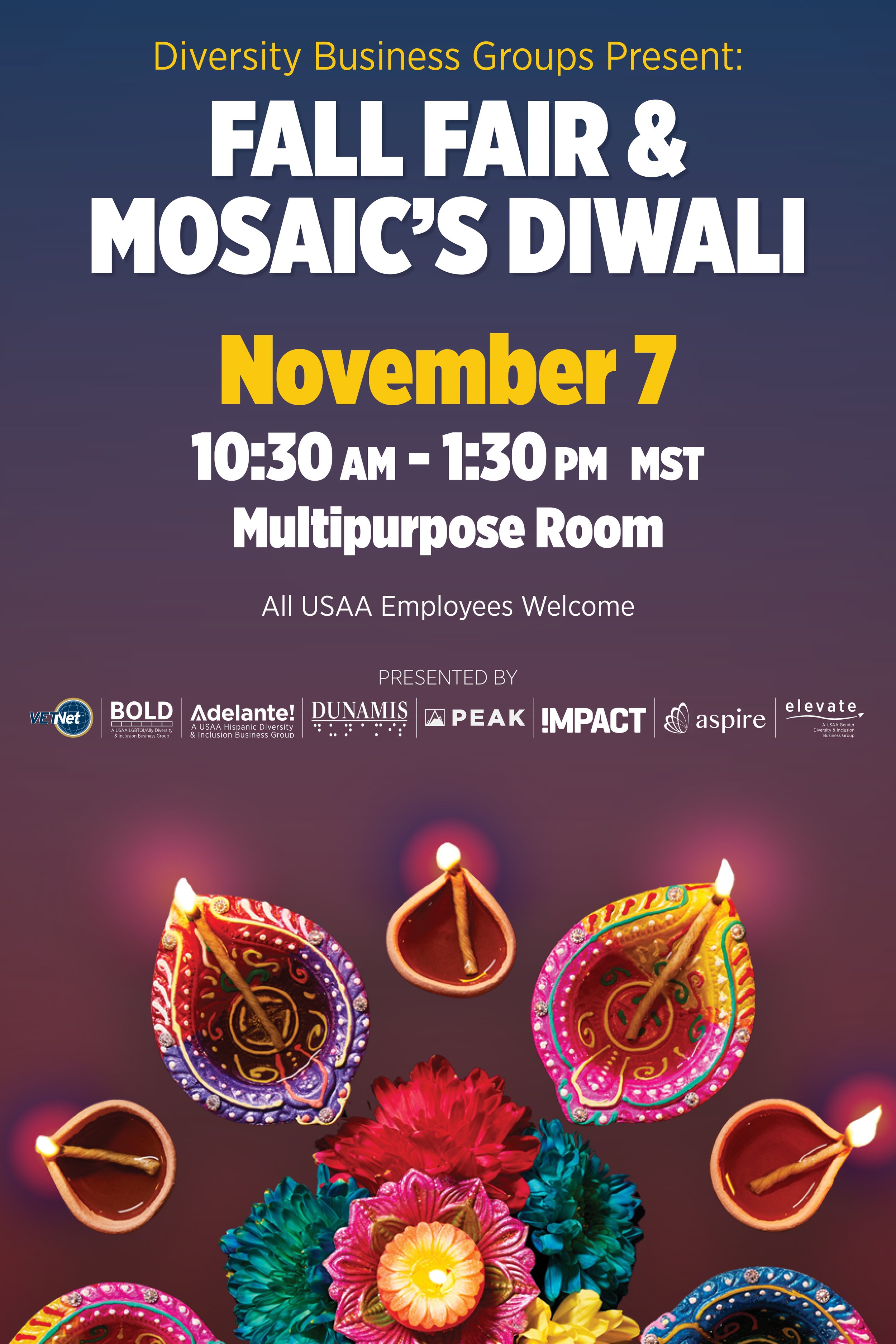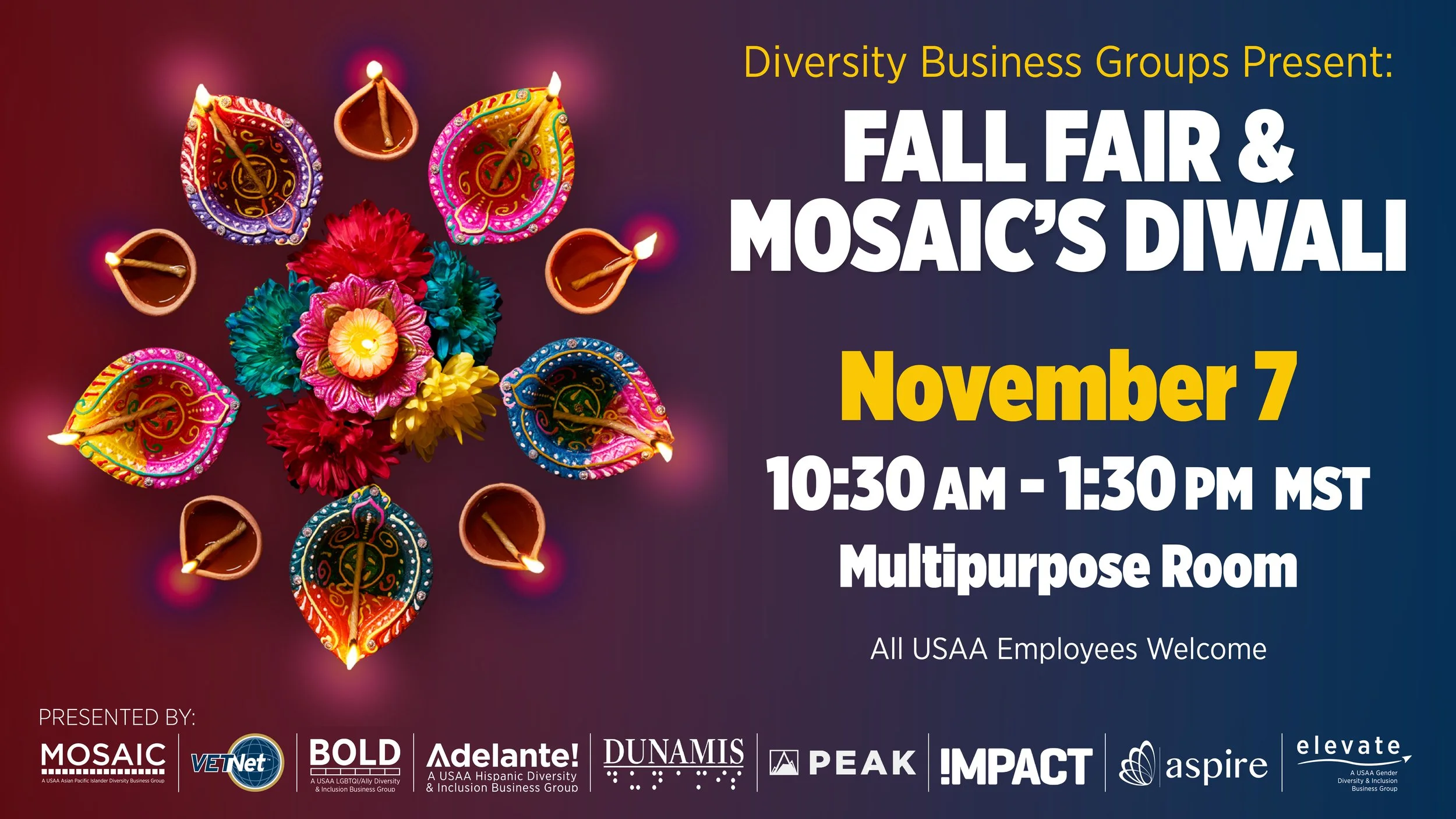 Cultural Celebrations Campaign How do you create an atmosphere that will allow thousands of employees feel seen and celebrated? For USAA's MOSAIC Employee Impact Group, the answer started with design. I created a full suite of themed internal communications — digital billboards, printed posters, flyers, Slack graphics, and Zoom backgrounds — to promote cultural celebration events held on campuses nationwide. Each campaign was built around the event's cultural identity, from AANHPI Heritage Month to Diwali's Festival of Lights to Holi's Festival of Colors, creating a distinct visual language for each while maintaining adherence to USAA's brand.