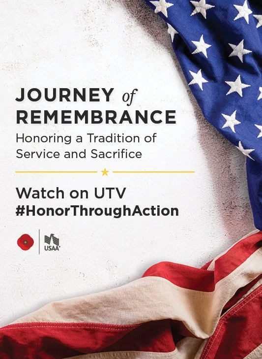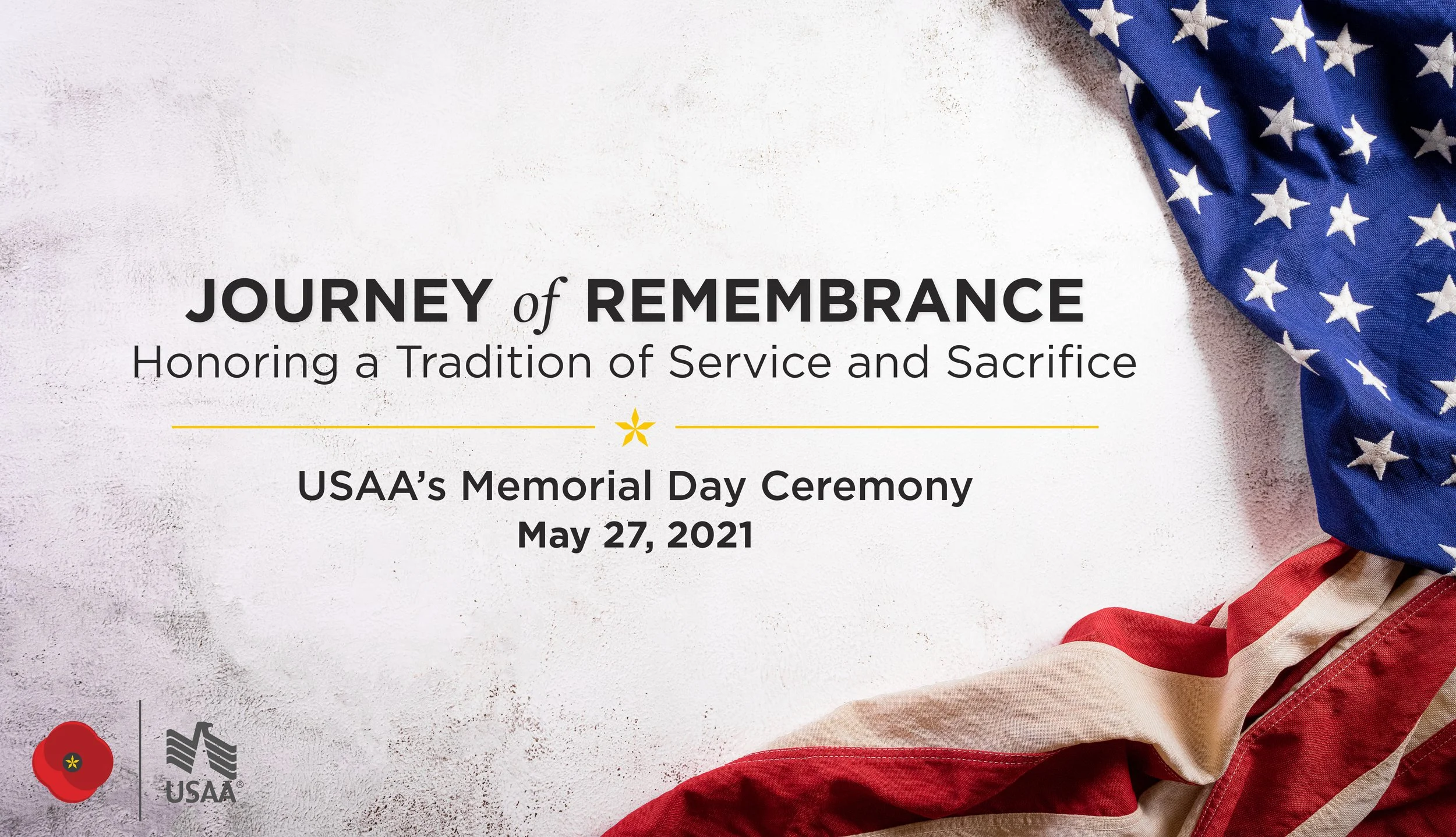 The graphic treatment for USAA's annual internal Memorial Day Ceremony, one of the company's largest and most ceremonially significant internal productions — a full-scale stage event featuring a color guard, live musical performances, and keynote speakers. The 2021 theme, Journey of Remembrance: Honoring a Tradition of Service and Sacrifice, guided a visual identity rooted in reverence and restraint. The title graphic served as the hero visual throughout the ceremony and in promotional materials leading up to the event.