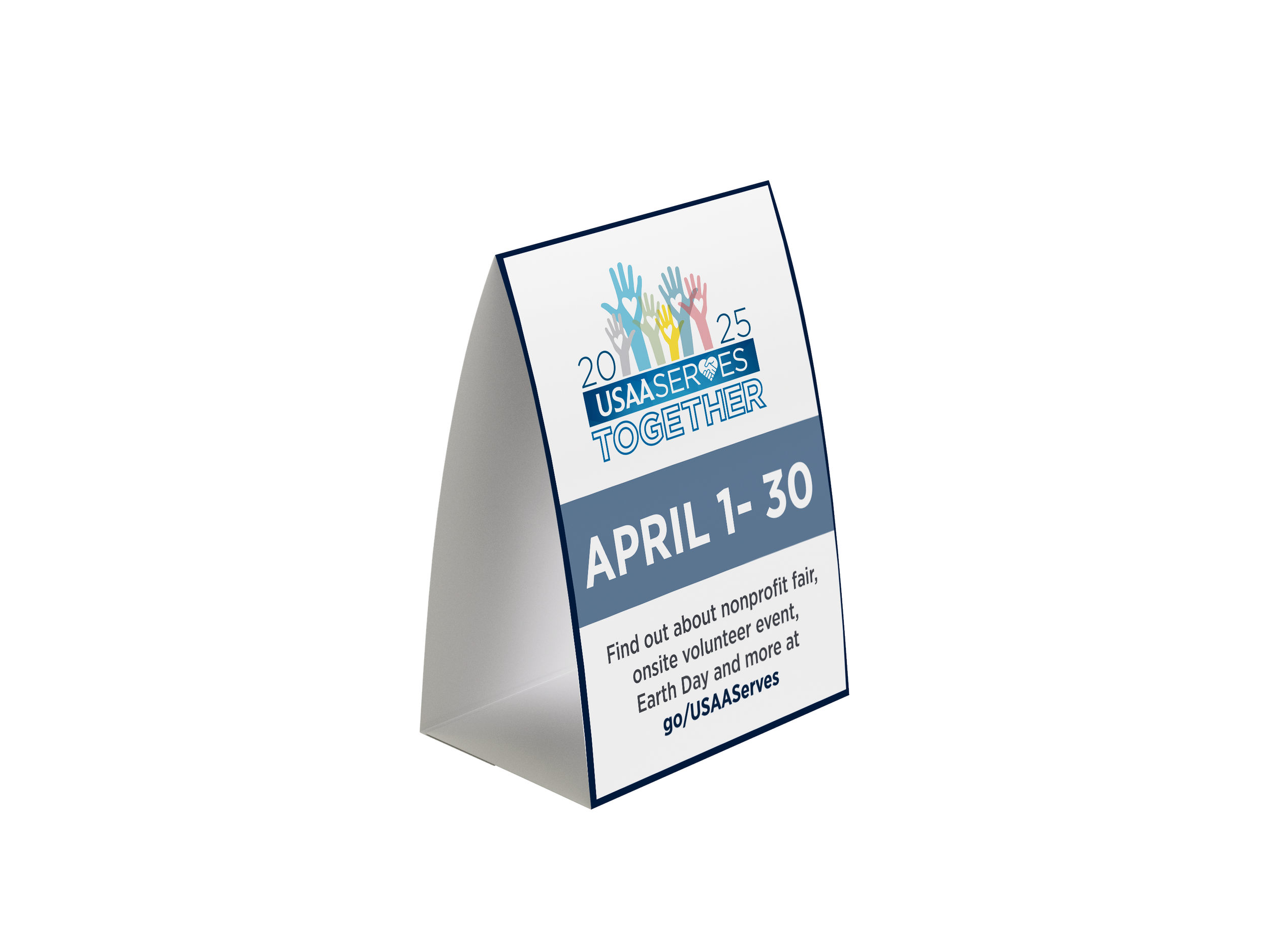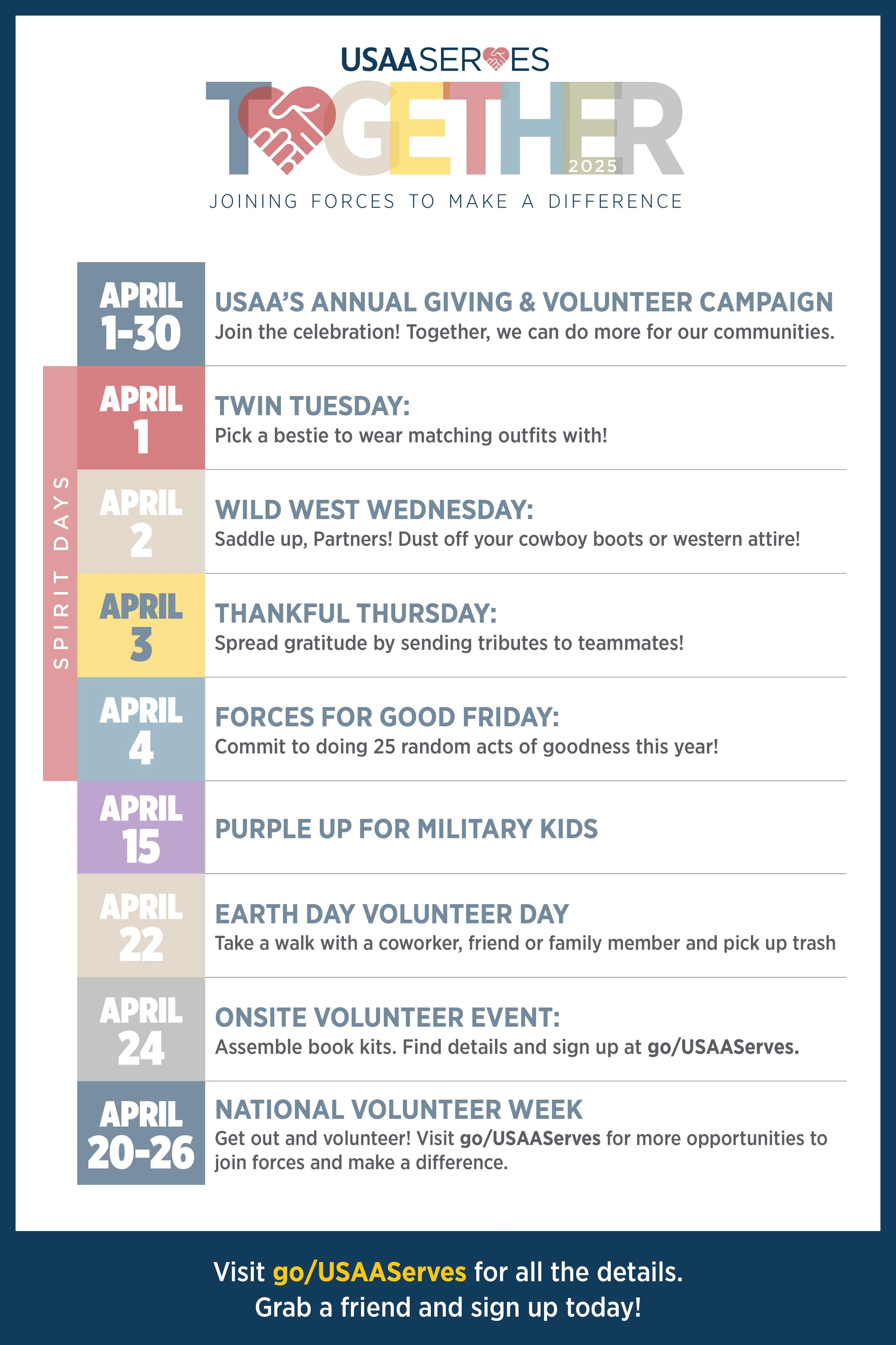 A full-suite campaign identity designed to rally employees around the company's annual charitable giving and volunteer initiative. The campaign, themed "Together," united employees across multiple campuses nationwide throughout the year, encouraging donations, volunteer sign-ups, and a series of spirit days tied to community-centered events. Deliverables spanned both print and digital channels, from large-format posters and desk tent cards to Zoom backgrounds distributed to the entire employee base.