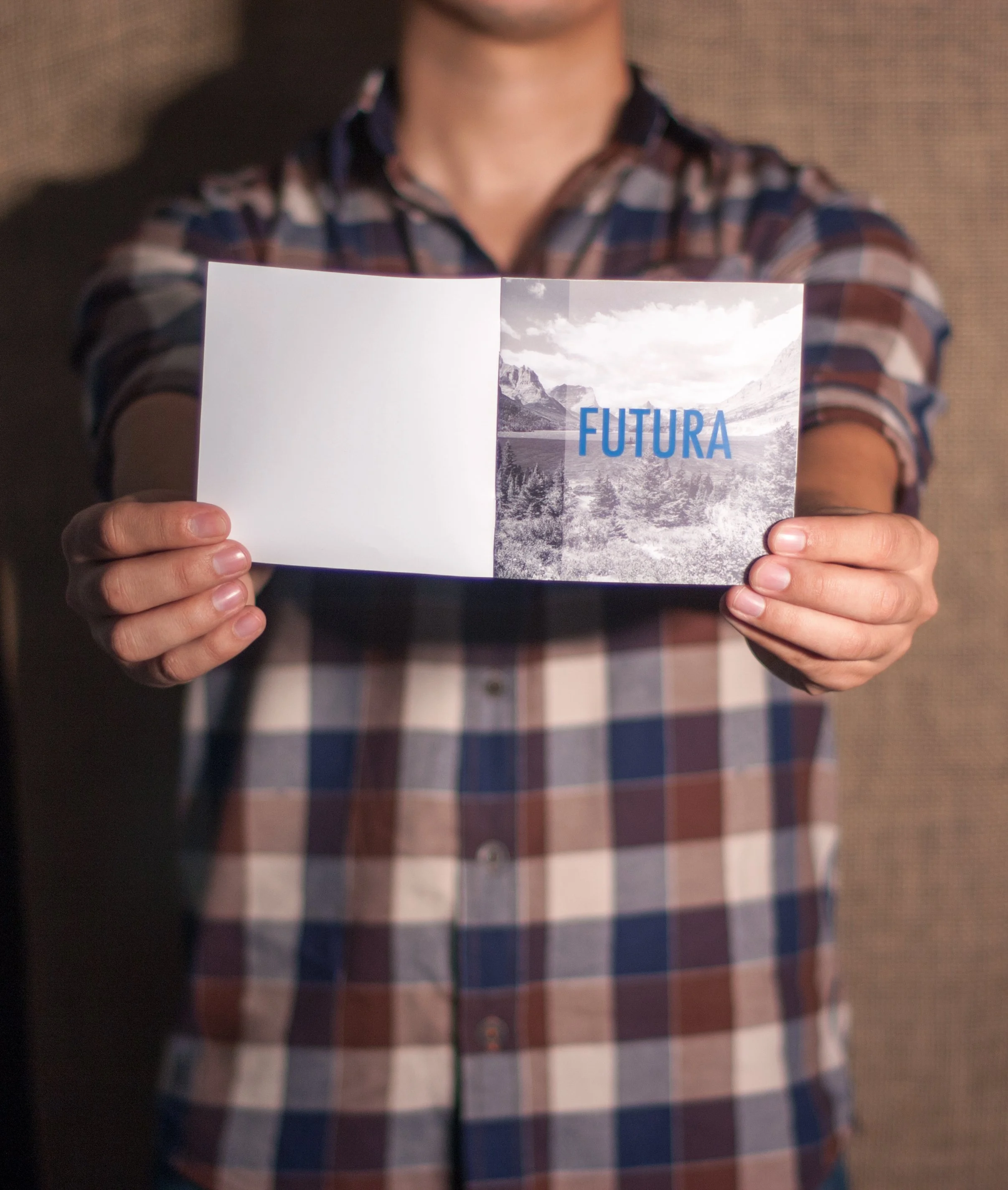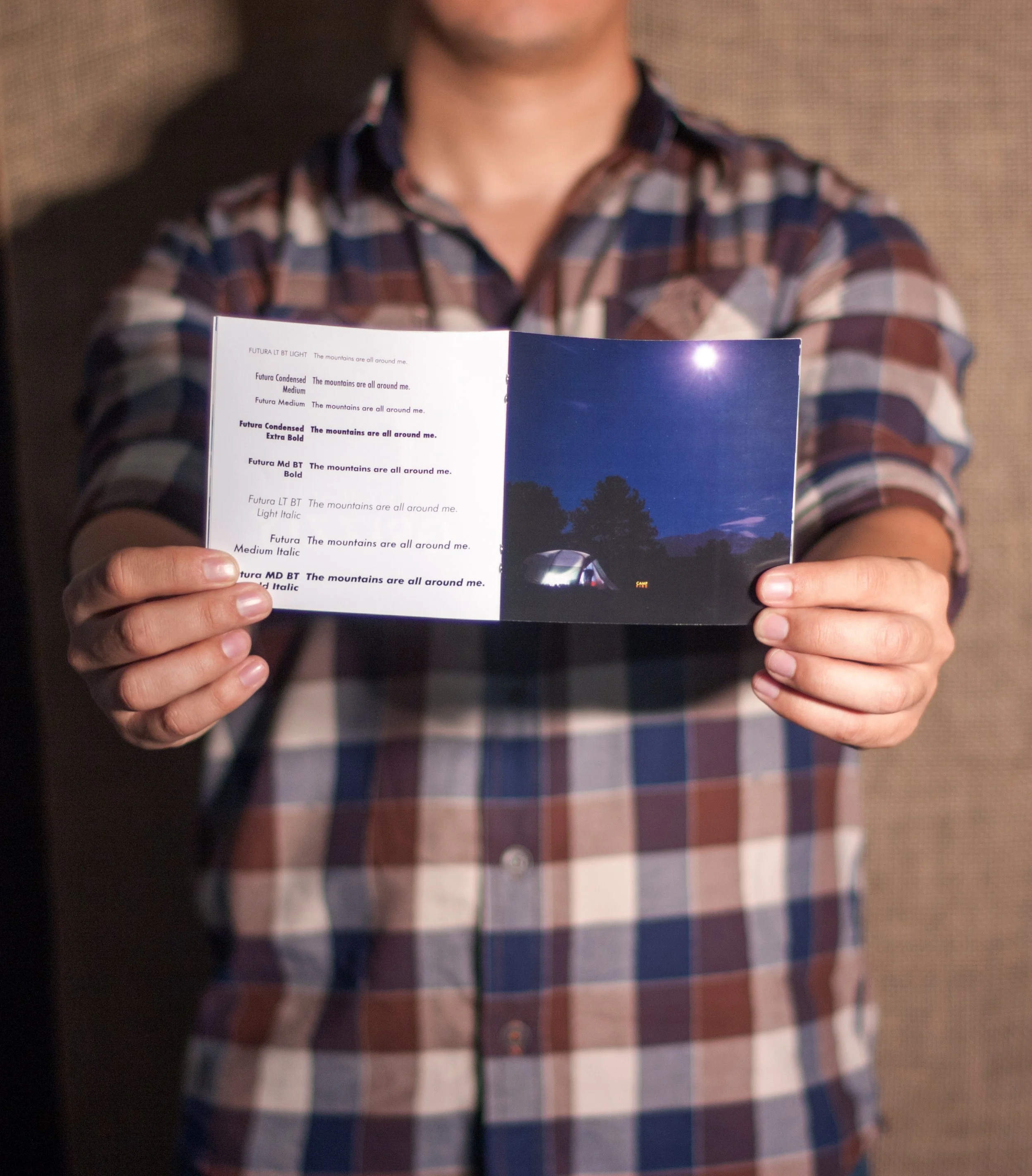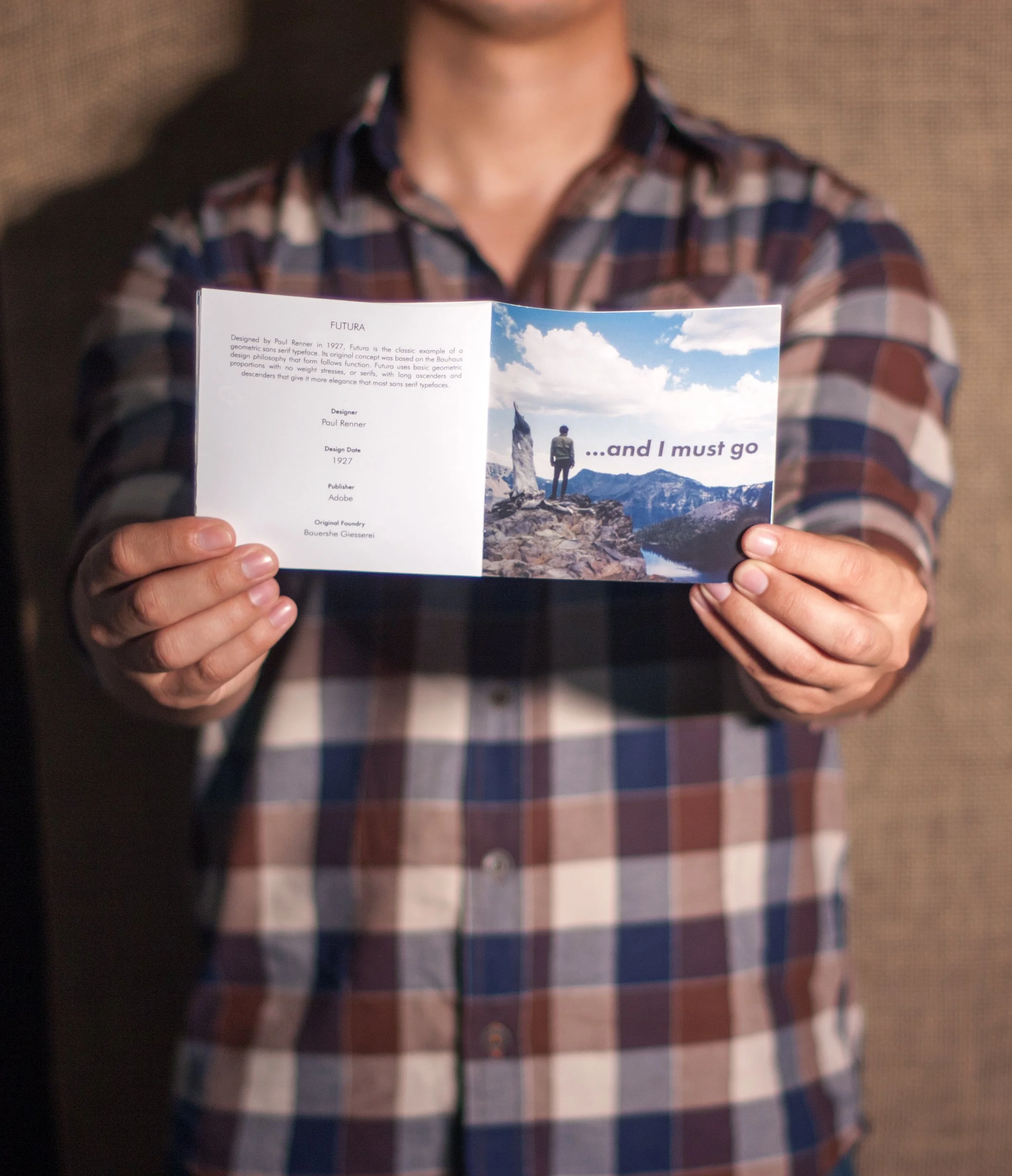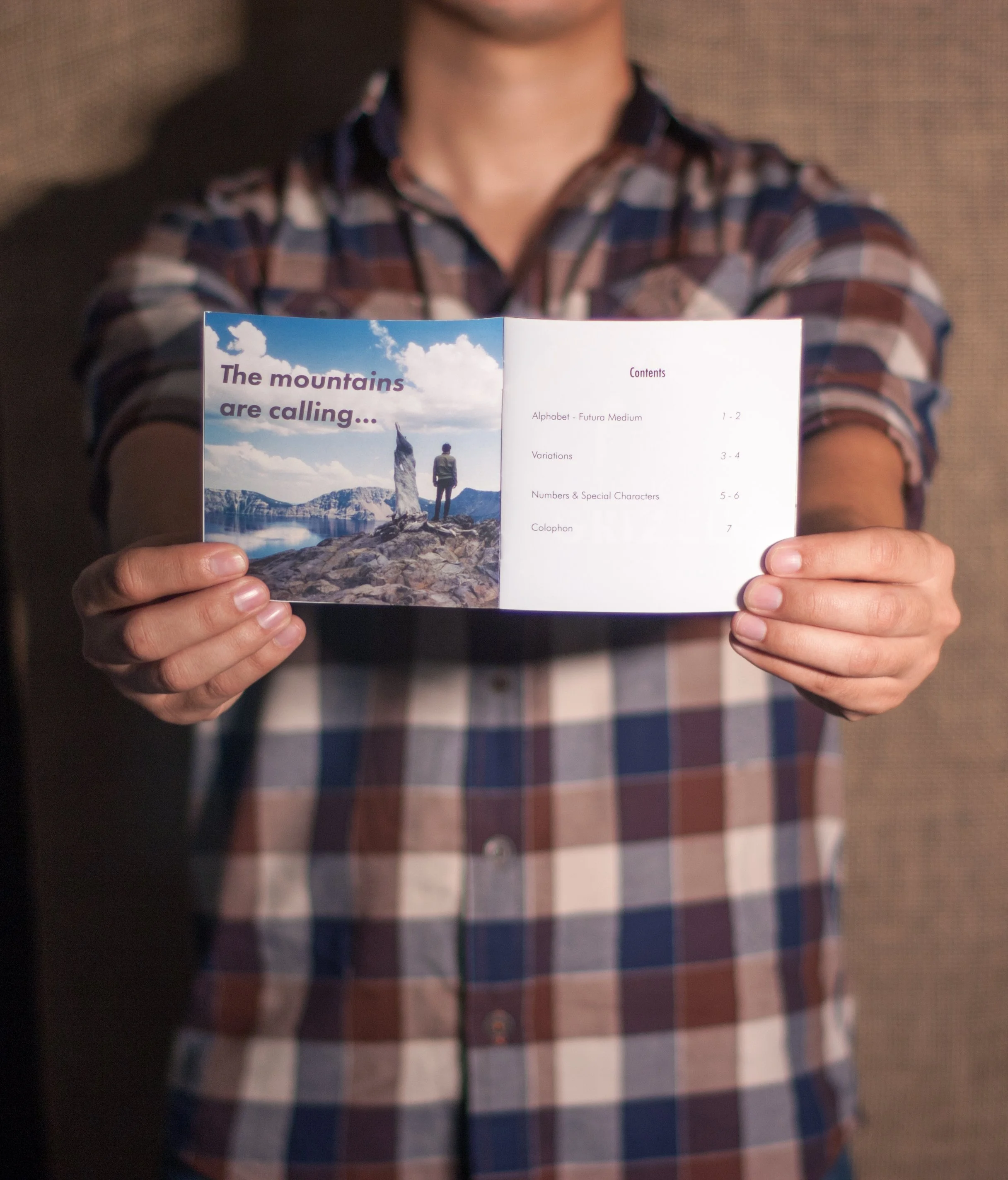 The brief was simple: choose a typeface and showcase it. I chose Futura, Paul Renner's 1927 geometric sans-serif, and built a thematic world around it. The booklet pairs Futura's near-perfect geometric construction with a rugged mountain wilderness aesthetic, letting the contrast between precise geometry and raw nature do the talking.